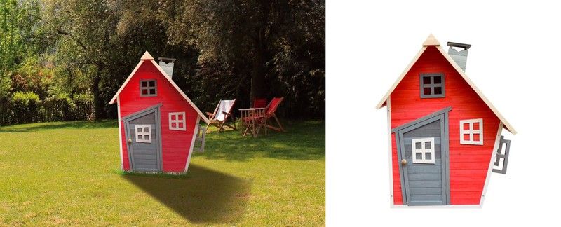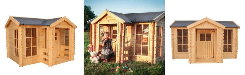 Ett exempel på allt detta är barnhuset i röd furu, med original asymmetrisk form, sadeltak med skorsten ingår, vikdörr och upp till fem fönster. Fantasin tar aldrig slut när du spelar i detta fantasihus!