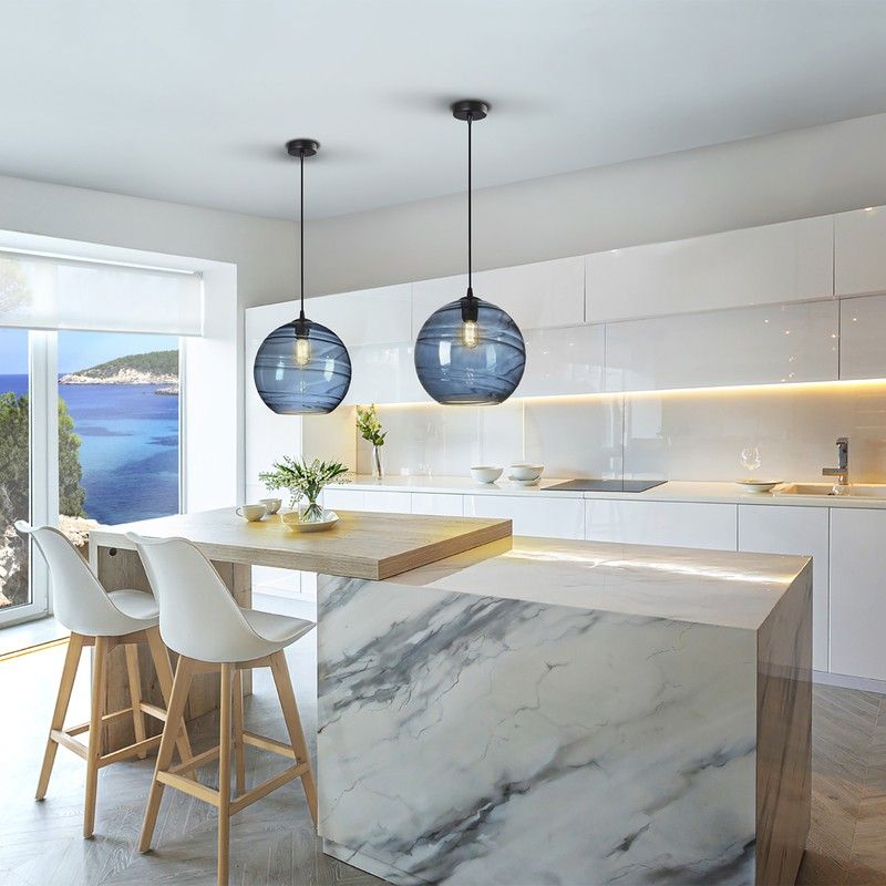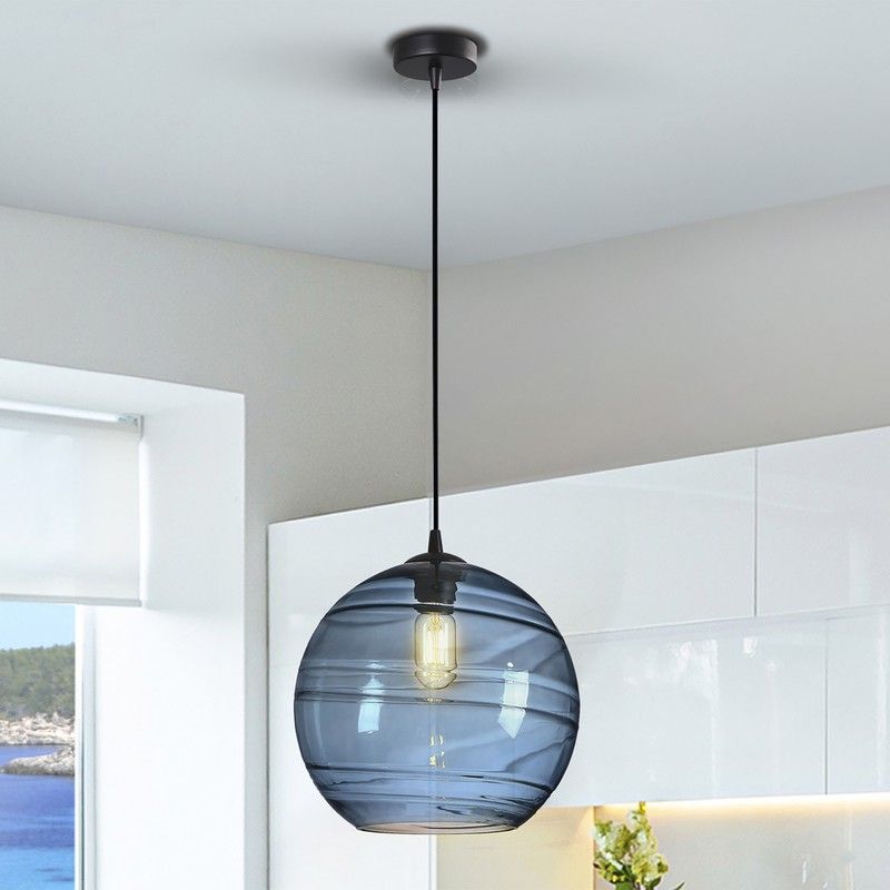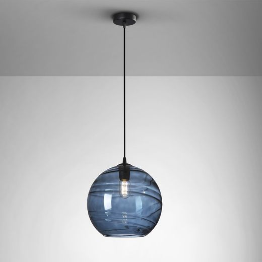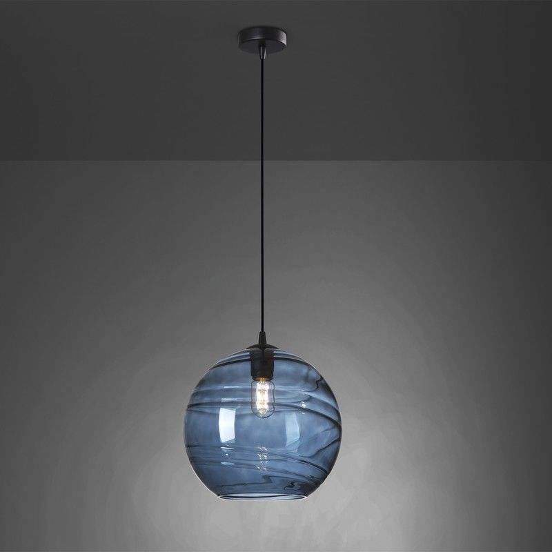 1-ljus lampa, gjord av metall med en matt svart finish. Stor sfärisk glasskärm, mörkblå ton. Höjdjusterbar.