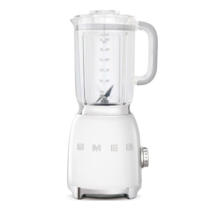 Vit Smeg glasblandare med stor kapacitet att förbereda dina bästa recept. Det har ett genomskinligt glas med mått märkta i liter och milliliter. Du kan lägga till dina ingredienser och slå eller krossa för att göra krämer, soppor, smoothies eller till och med hugga is tack vare de flyttbara rostfria blad. Ta med den vintage och originella kontakten i ditt kök med denna lilla apparat med 50-talets estetik.